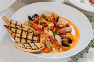 A savory, seafood sensation. Halibut, Shrimp, Littleneck Clams, PEI Mussels all bathed in a White Wine and Saffron-Infused Tomato Broth and served with grilled bread.
